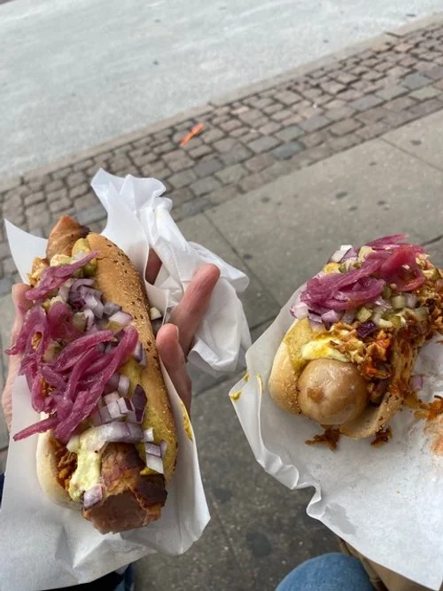Figure 8. Hotdogs with ‘everything’ at John’s polsevogn (sausage wagon - hotdog cart), Central Station, Copenhagen